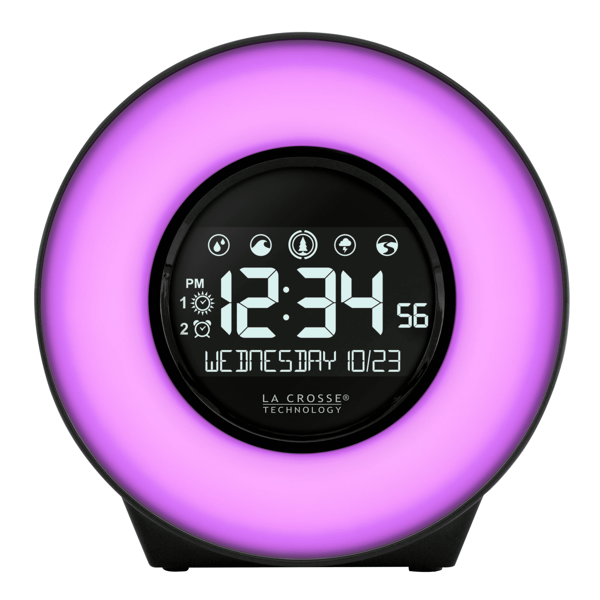 Uniquely designed digital mood light alarm clock, equipped with a variety of nature sounds to soothe even the most stressful of days. This easy-to-use alarm allows you to choose from seven different light colors depending on your mood, or if you can’t decide on one, simply set it to cycle mode and watch as the colors fade into the next. We know how difficult it can be to sleep with a bright light next to you in bed, so not only was it designed with five different brightness level settings, but as was the lcd display. Fall asleep to the soothing sound of a flowing river, and wake up to seagulls chirping while ocean waves crash into a beach. With five different nature sounds to choose from, you will wake up as peacefully as you fell asleep. Before heading to bed, use the sleep timer to program a nature sound of choice to play for 15 to 90 minutes before bed, and don’t forget to set your snooze timer if you’d prefer 10 more minutes of sleep. Whether you need a quick break before dinner or in between classes, the nap timer allows you to take a 5-120 minute nap without disrupting your previous set alarms. Here at la crosse technology, we will always design with you in mind. Use the usb charging port to power your phone or other device without taking up unnecessary space on the outlet. Padded bottom keeps the alarm from sliding while programming or hitting the snooze button. The digital mood light alarm clock with nature sounds makes the perfect addition for any age group.
