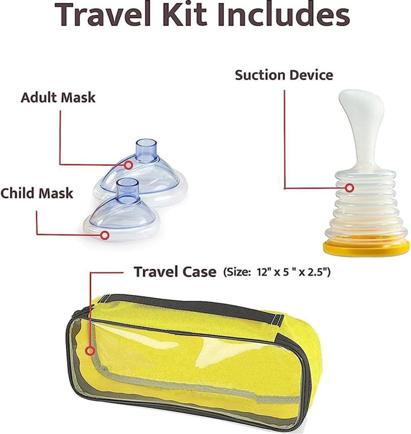 • Yellow Travel Kit Cover Children and Adults: Take the Travel Kit with you on the road. Yellow Travel Kit includes One LifeVac suction device with a patent-pending one-way Valve, One Pediatric Mask, One Adult Mask, and One Set of Instructions for using the LifeVac, all included in a Yellow Durable Travel Bag.