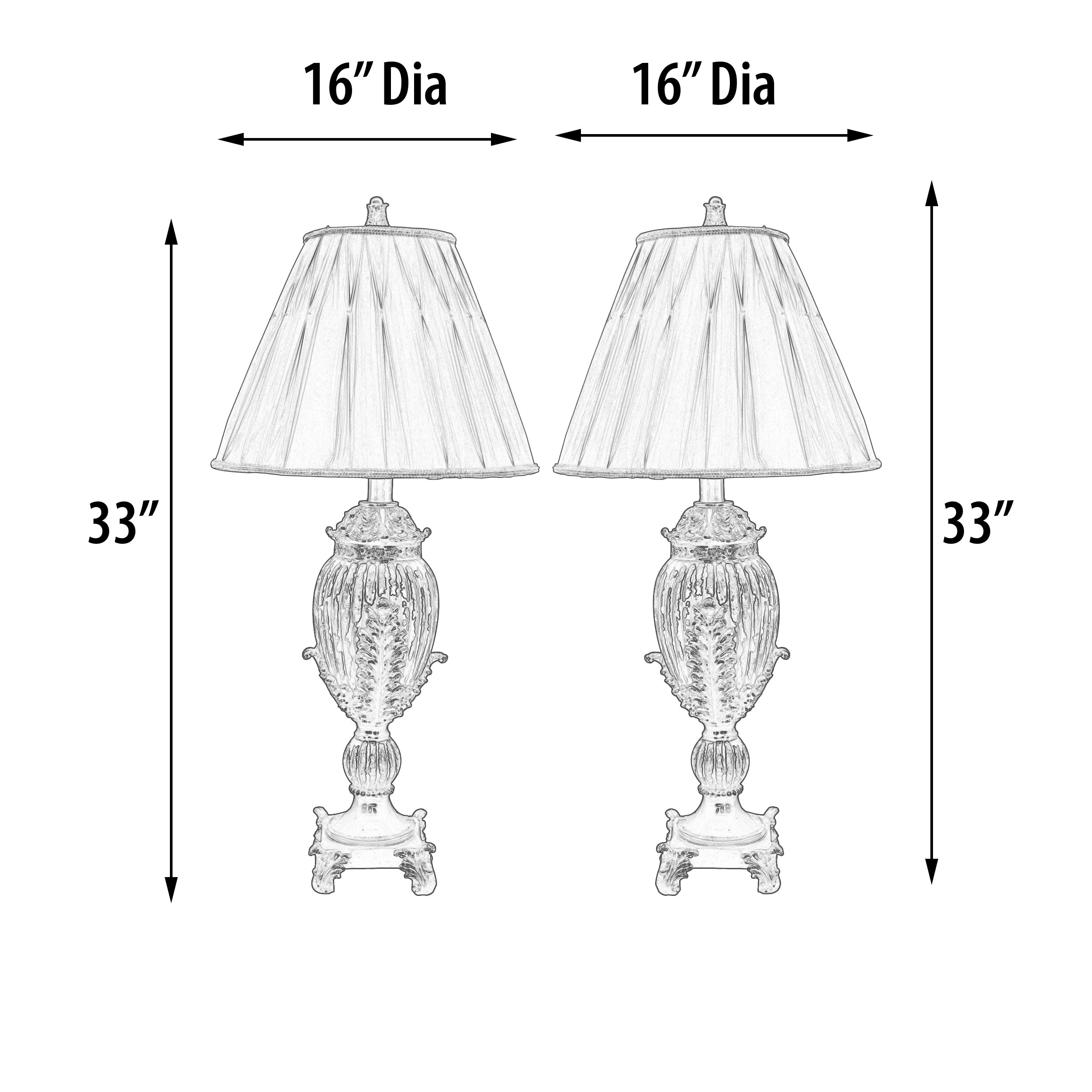 An elegant pair of lamps, accented with acanthus leaves on footed pedestal. Hand Cast and Hand Finished using an alluring Shabeen Silver Metal Leaf over an opalesque poly resin form. Final dark antiquing is rubbed on to bring out the carved details and undertones, giving each piece uniqueness. The shade is pleated with corded detail accents on the top and bottom. Each lamp comes with shade, harp, and lamp base. The wiring and socket are UL listed using standard E27/26 bulbs with a wattage up to 40 watts. Bulbs are not included.