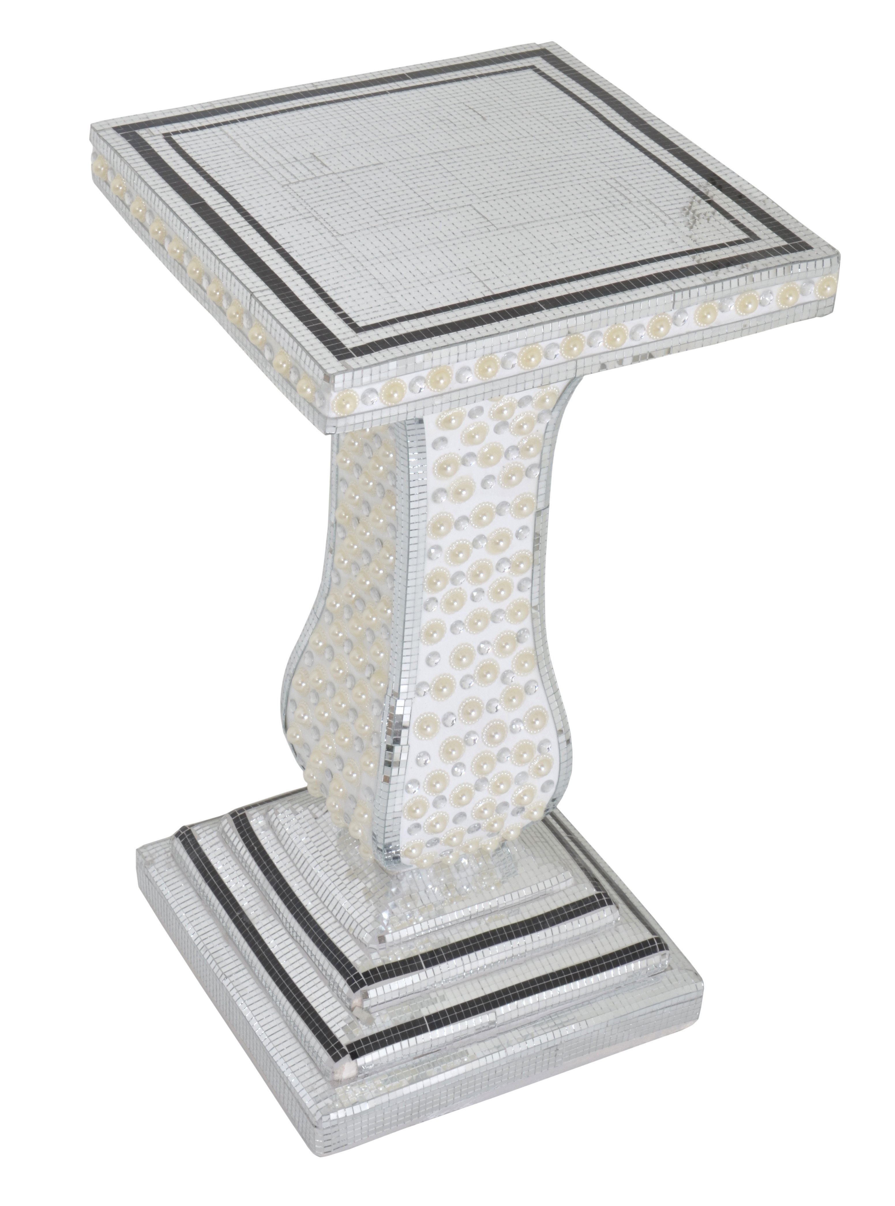 This stunning Pearlescent Pedestal Table features a beautiful vivid Pearl finish trimmed by durable fiberglass and meticulously veneered in micro mosaic mirrored tile. The table is entirely crafted by hand. Perfect for just about any Hollywood Regency decor home, this table requires no assembly and provides a big look for an amazing price.